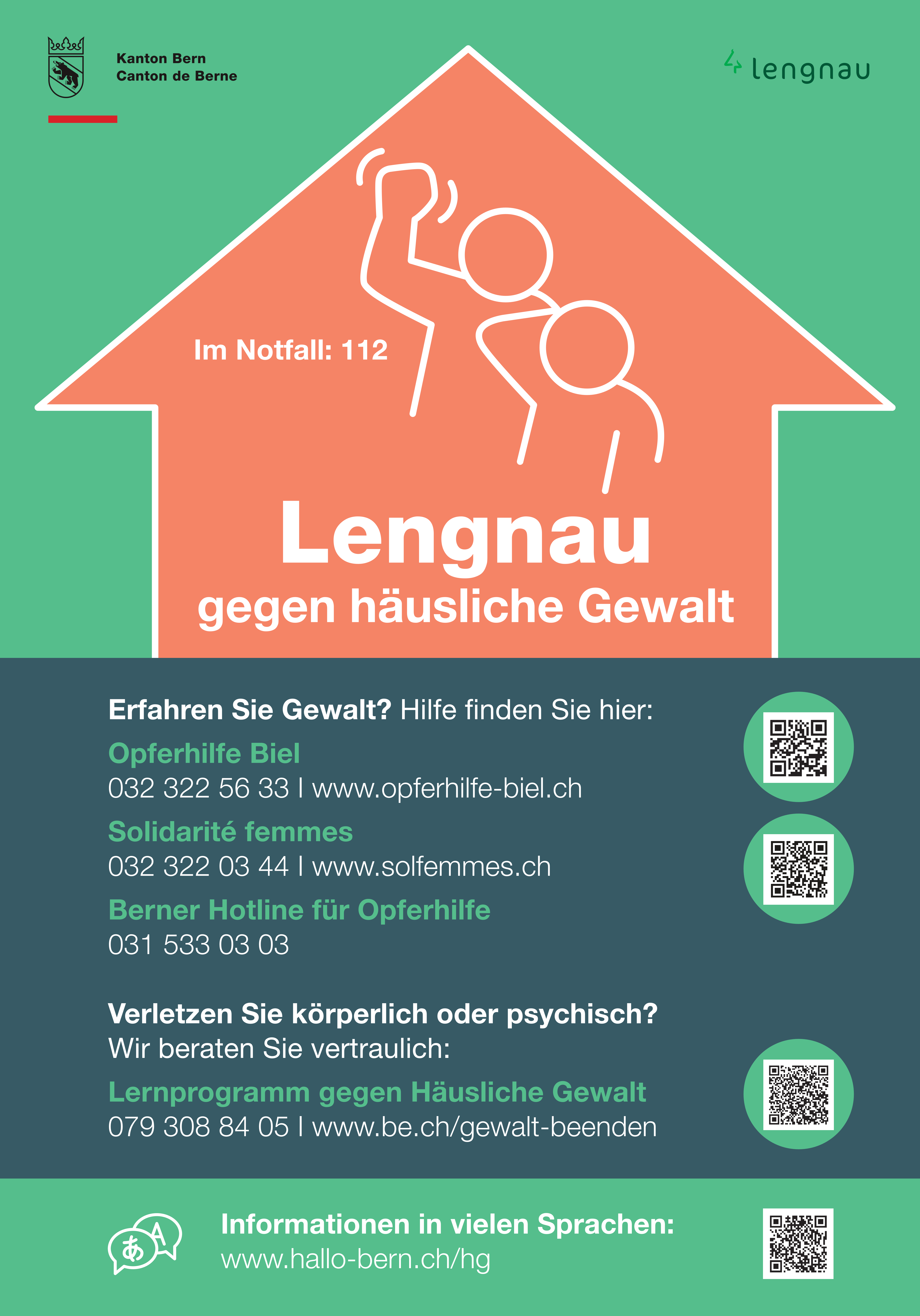 Bei Gewalt in Partnerschaften, Ehe und Familie finden Sie im Kanton Bern an folgenden Stellen Hilfe und Unterstützung:
